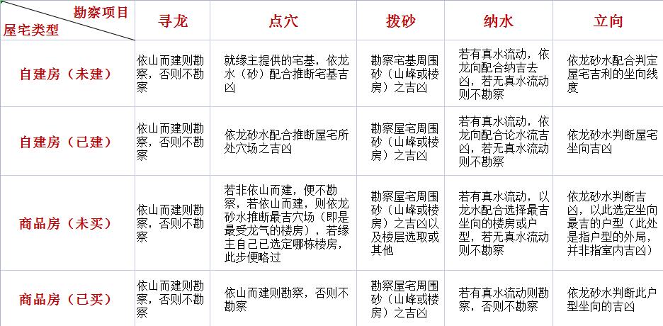 若是已买商品房:按照上表的内容去勘察,龙穴砂水向,不管是吉是凶都已成事实,所以,此类屋宅的风水勘察,重点是室外的砂水吉凶,若凶,缘主再考虑是否化解