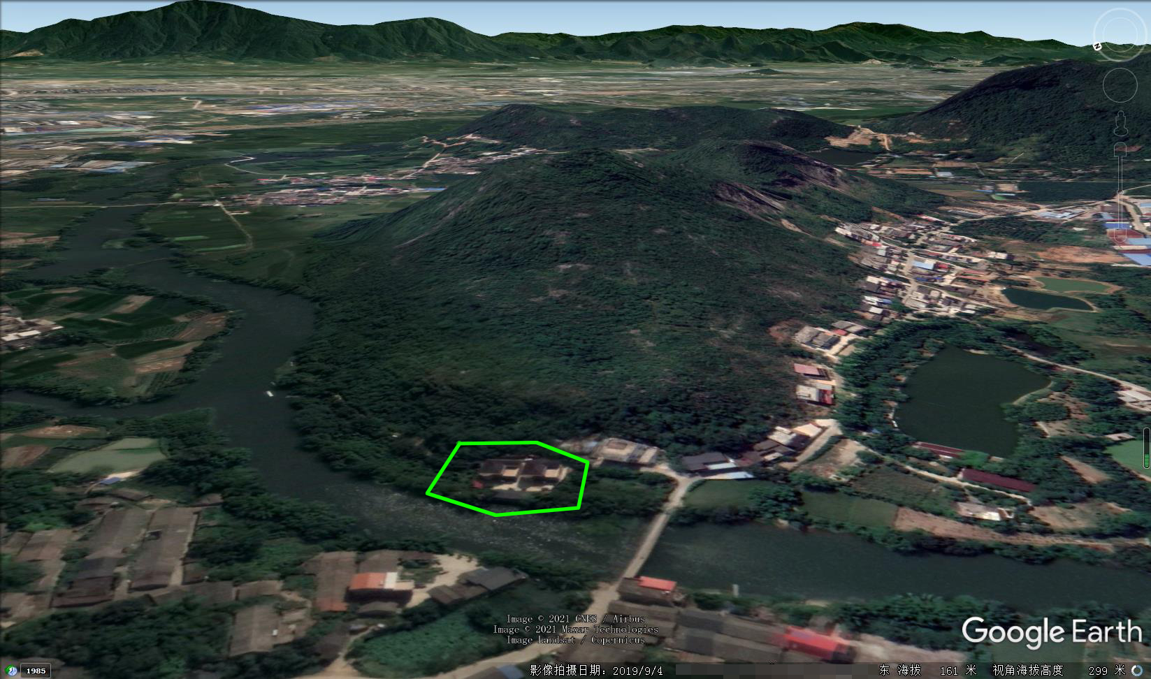 比如是已建自建房:因为房子已经建好了,所有不需要我拉坐向给你,风水勘察主要是论此屋宅的龙穴砂水是吉是凶,上表已有介绍。就像上图绿圈屋宅勘察周围砂的吉凶,若都吉利,便是好风水,若有凶性便需化解。此类风水勘察尽量本人到场勘察,或者缘主提供屋宅的地址,只要在卫星地图能找到,便可勘察此宅的外局风水
